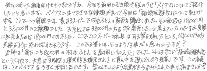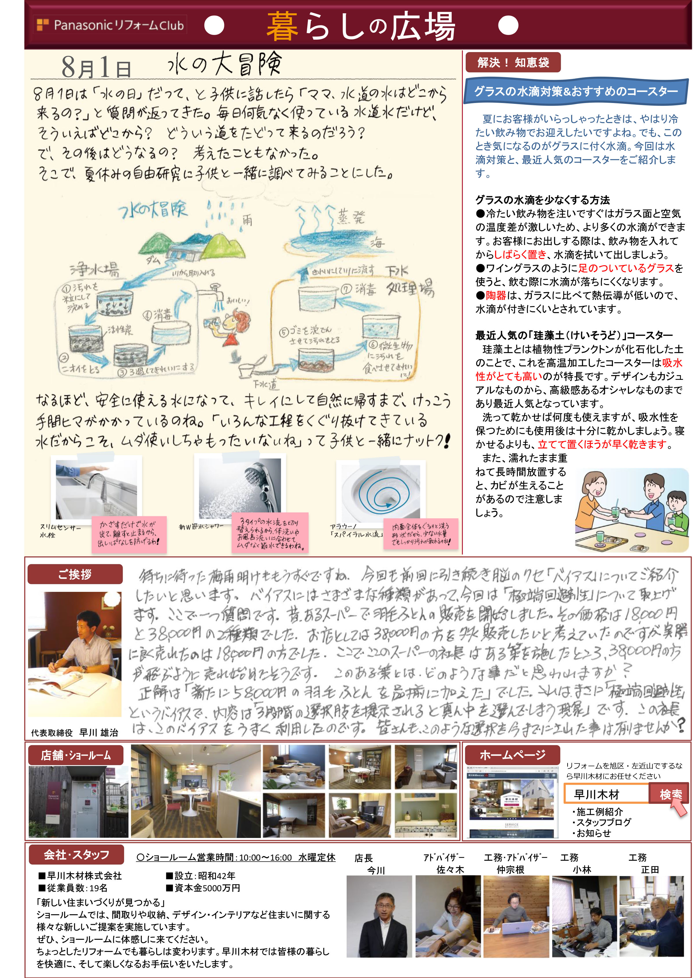 無料診断 無料見積り・相談 電話で見積り・相談 0120-734-722 【受付】10:00~16:00【定休日】日曜日 電話で見積り・相談 HOMEイベント・チラシチラシ2019年8月”暮らしの広場” 2019年8月”暮らしの広場” 暮らしの広場8月号「いつでも節水」 水にこまらない国にすんでいるからこそ、それに感謝して大切に使う毎日を過ごす。水道水が安価に買えるからといって無駄に使っていては、いつか困ることになるのは次の世代かもしれません。普段の生活から、無駄に水を使わないように家電などでお手伝いすることも可能ですので、お買い替えの際にはご一考ください。ここちよいと感じることができる空間をつくるのに、私たちがどういうお手伝いをできるか?いつも皆で考えています。一度ご相談ください。スタッフ一同お待ちしております。 一言 水を大切に暮らす 備考 水道からでる水はエネルギーを使って届けられています。節水は大切ですよね。 イベントへのお申し込みはこちらから 必須お名前 例: 山田 太郎 必須電話番号 例: 045-000-0000 必須イベント名 例: 完成見学会 必須参加希望日 例: 1/1 10:00-12:00 必須参加人数 例:2名 任意メールアドレス 例: t_yamada@sample.jp 任意郵便番号 住所検索 例: 123-4567 任意住所 例:神奈川県横浜市**** 任意お問い合わせ内容 ※お急ぎの方は、 直接 0120-734-722(10:00~16:00)まで、お電話下さい。 例:○月○日の○○○イベントに参加希望です。 ※相談内容は個人情報保護法に適用いたします。 24時間以内に回答を心がけておりますが、相談内容等によって、 2〜3日かかる事もございますが御了承下さい。 お電話でもお気軽にどうぞ! 内容をご確認の上、よろしければ下記の「入力内容を確認する」ボタンを押して下さい。 個人情報利用目的 ・お客様のご要望に合わせたサービスを提供させていただくための各種ご連絡。 ・お問い合わせいただいたご質問への回答のご連絡。 尚、お客様から収集する個人情報は弊社の定めるプライバシーポリシーに則って厳重に管理いたします。 プライバシーポリシー 弊社では、利用者のみなさんの個人情報がきちんと守られることを、何よりも大切にしています。また、利用者ご本人への事前の許可なしに第三者に個人情報を配送作業以外に開示することは絶対にいたしません。 どんな些細な事でも結構です。ご相談、お見積もりなど、お気軽にご連絡下さい。上記メールフォームからご連絡いただくか、電話にてご連絡下さい。 必須マークがついている項目は必ずご記載下さい。(株)、(有)や丸囲み数字等の機種依存文字は、文字化けの原因となりますので、使用しないようお願いいたします。