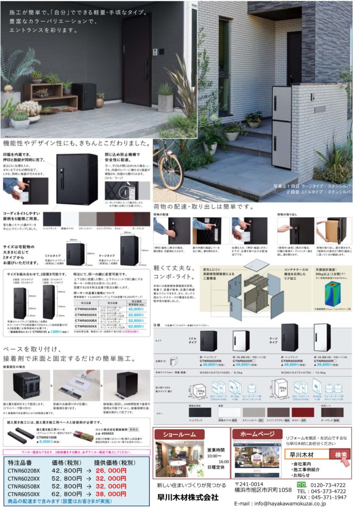 無料診断 無料見積り・相談 電話で見積り・相談 0120-734-722 【受付】10:00~16:00【定休日】日曜日 電話で見積り・相談 HOMEイベント・チラシチラシ2020年6月宅配専用ボックス 2020年6月宅配専用ボックス ご家庭ごとに、宅配の利用目的や使用頻度は変わりますが、ご不在時でも荷物を受け取れる”コンボ ライト”で、さらに快適なネットショッピングライフを過ごしませんか。横浜市内へのお届けは無料!ぜひ、お声掛けください。*本体をボンドで固定する際には専用の「据え置き施工用ベース」をご利用ください。 一言 ご自身で設置できます! 備考 【横浜市内のお客様へ特別価格】 イベントへのお申し込みはこちらから 必須お名前 例: 山田 太郎 必須電話番号 例: 045-000-0000 必須イベント名 例: 完成見学会 必須参加希望日 例: 1/1 10:00-12:00 必須参加人数 例:2名 任意メールアドレス 例: t_yamada@sample.jp 任意郵便番号 住所検索 例: 123-4567 任意住所 例:神奈川県横浜市**** 任意お問い合わせ内容 ※お急ぎの方は、 直接 0120-734-722(10:00~16:00)まで、お電話下さい。 例:○月○日の○○○イベントに参加希望です。 ※相談内容は個人情報保護法に適用いたします。 24時間以内に回答を心がけておりますが、相談内容等によって、 2〜3日かかる事もございますが御了承下さい。 お電話でもお気軽にどうぞ! 内容をご確認の上、よろしければ下記の「入力内容を確認する」ボタンを押して下さい。 個人情報利用目的 ・お客様のご要望に合わせたサービスを提供させていただくための各種ご連絡。 ・お問い合わせいただいたご質問への回答のご連絡。 尚、お客様から収集する個人情報は弊社の定めるプライバシーポリシーに則って厳重に管理いたします。 プライバシーポリシー 弊社では、利用者のみなさんの個人情報がきちんと守られることを、何よりも大切にしています。また、利用者ご本人への事前の許可なしに第三者に個人情報を配送作業以外に開示することは絶対にいたしません。 どんな些細な事でも結構です。ご相談、お見積もりなど、お気軽にご連絡下さい。上記メールフォームからご連絡いただくか、電話にてご連絡下さい。 必須マークがついている項目は必ずご記載下さい。(株)、(有)や丸囲み数字等の機種依存文字は、文字化けの原因となりますので、使用しないようお願いいたします。