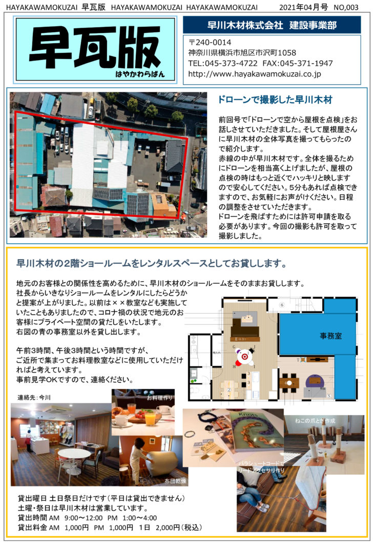 無料診断 無料見積り・相談 電話で見積り・相談 0120-734-722 【受付】10:00~16:00【定休日】日曜日 電話で見積り・相談 HOMEイベント・チラシチラシ2021年4月早瓦版 屋根の点検はドローンが便利 2021年4月早瓦版 屋根の点検はドローンが便利 一言 屋根の点検はドローンが便利 イベントへのお申し込みはこちらから 必須お名前 例: 山田 太郎 必須電話番号 例: 045-000-0000 必須イベント名 例: 完成見学会 必須参加希望日 例: 1/1 10:00-12:00 必須参加人数 例:2名 任意メールアドレス 例: t_yamada@sample.jp 任意郵便番号 住所検索 例: 123-4567 任意住所 例:神奈川県横浜市**** 任意お問い合わせ内容 ※お急ぎの方は、 直接 0120-734-722(10:00~16:00)まで、お電話下さい。 例:○月○日の○○○イベントに参加希望です。 ※相談内容は個人情報保護法に適用いたします。 24時間以内に回答を心がけておりますが、相談内容等によって、 2〜3日かかる事もございますが御了承下さい。 お電話でもお気軽にどうぞ! 内容をご確認の上、よろしければ下記の「入力内容を確認する」ボタンを押して下さい。 個人情報利用目的 ・お客様のご要望に合わせたサービスを提供させていただくための各種ご連絡。 ・お問い合わせいただいたご質問への回答のご連絡。 尚、お客様から収集する個人情報は弊社の定めるプライバシーポリシーに則って厳重に管理いたします。 プライバシーポリシー 弊社では、利用者のみなさんの個人情報がきちんと守られることを、何よりも大切にしています。また、利用者ご本人への事前の許可なしに第三者に個人情報を配送作業以外に開示することは絶対にいたしません。 どんな些細な事でも結構です。ご相談、お見積もりなど、お気軽にご連絡下さい。上記メールフォームからご連絡いただくか、電話にてご連絡下さい。 必須マークがついている項目は必ずご記載下さい。(株)、(有)や丸囲み数字等の機種依存文字は、文字化けの原因となりますので、使用しないようお願いいたします。